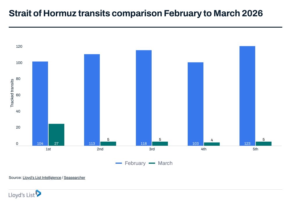 Oil cargo transits through Hormuz collapsed from around 100 ships a day to near zero after missile strikes. War risk insurance premiums jumped from 0.1% to 1.0% of vessel value, with 3% for US or Israel-affiliated vessels. “Premiums that high create a de facto blockade for most commercial operators, even if the waterway is technically open,” says Konrad.